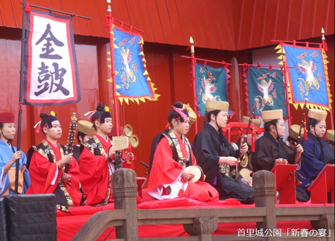 琉球王国時代に行われた正月儀式「朝拝御規式」の一部の紹介や、国王・王妃の登場をはじめ、琉球王国時代の宮廷音楽である御座楽の演奏やお正月書初め体験、首里城正殿復元工事で生まれた端材に好きな文字や絵を描き、自分だけのオリジナルストラップを作る「端材 de つくろう」など様々なプログラムが用意されています。正月は首里城公園にて沖縄らしいお正月の雰囲気を楽しんではいかがでしょうか。