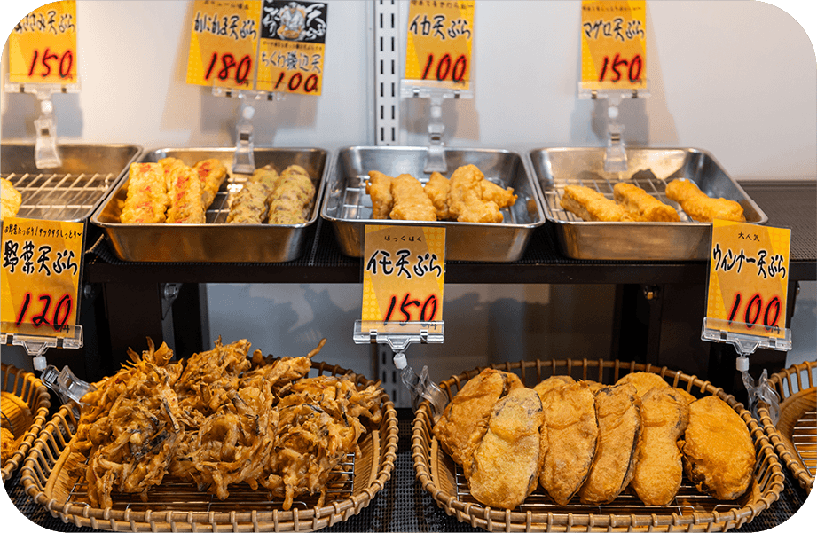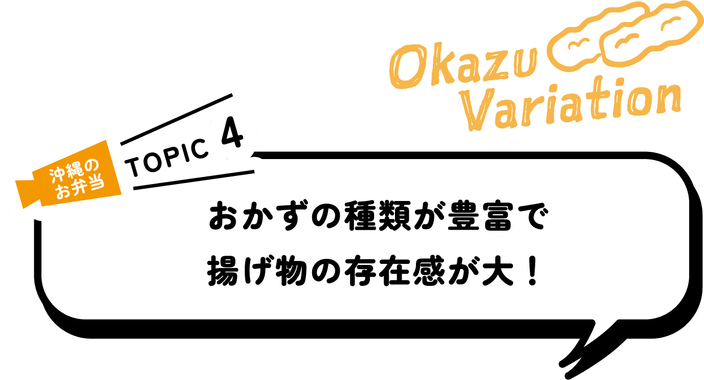 おかずのバリエーションも「うちなー弁当」の魅力のひとつで、「どれにしようかな」と迷ってしまいます。また、トンカツや唐揚げ、天ぷらなどの揚げ物をメインにしたお弁当も多く、お店によっては「揚げ物」だけのケースが設けられていることもあります。