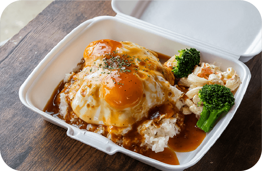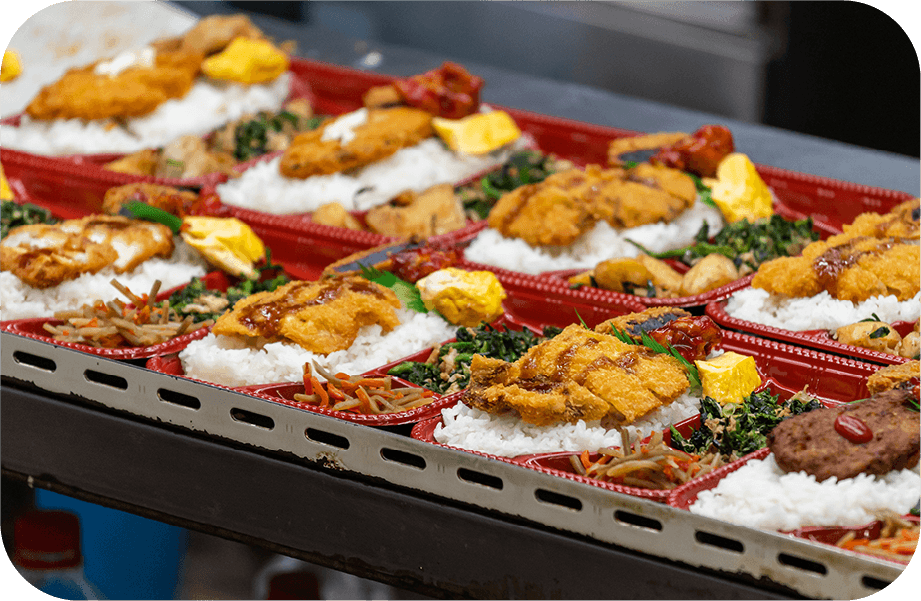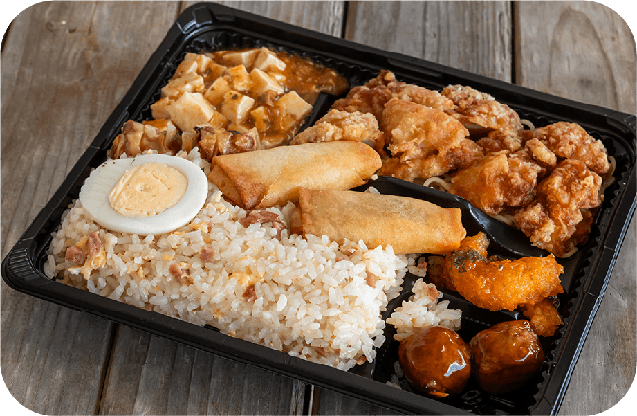 沖縄で「うちなー(沖縄)弁当」と称される定番のお弁当の特徴のひとつが、ご飯におかずをのせるスタイル。丼物とは異なり、お弁当箱にご飯を敷き詰め、その上にいくつものおかずをのせています。ぜひお弁当屋で実際に確認してみてください。