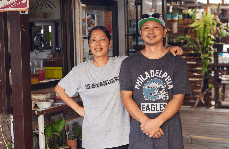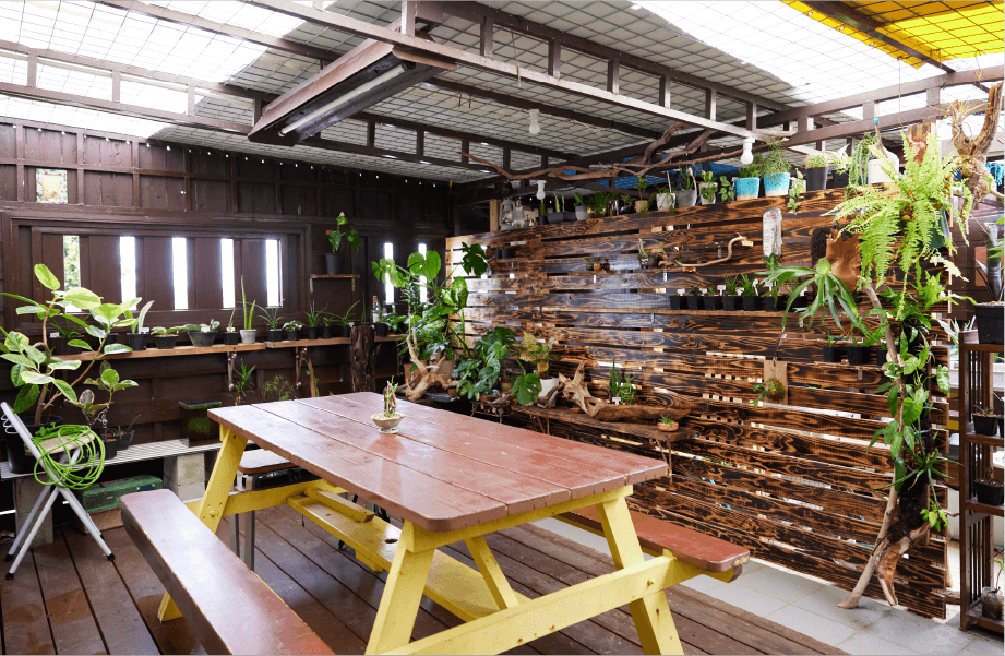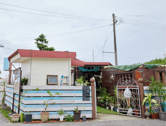 うるま市の平敷屋(へしきや)漁港の側に建つ「パーラーみなと」は、テイクアウト用カウンターとイートインスペースを設けており、テラスはたくさんの植物に囲まれた憩いの場となっています。「もともと鉢植えが好きで、お店に並べていたらいつのまにか増えていました。リラックスできるのか、コーヒーを飲みながら2時間ゆっくり植物を眺めている常連さんもいます」と微笑む店主の山田さん。