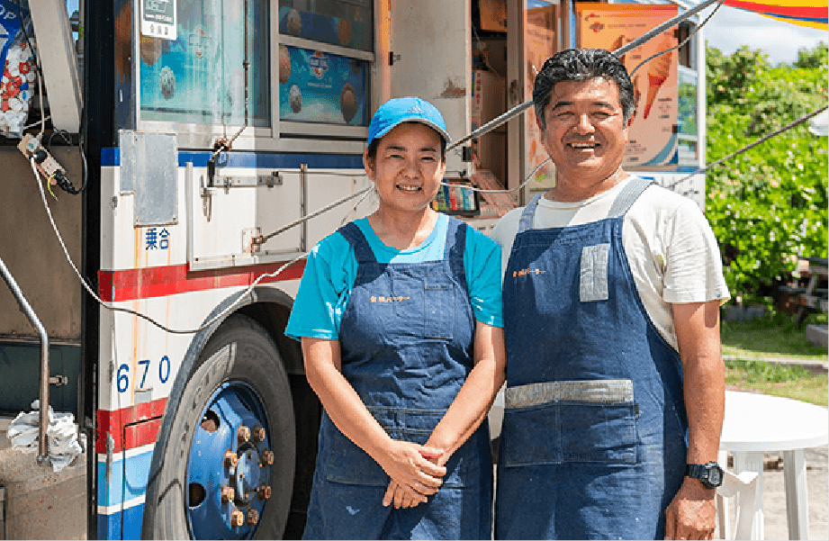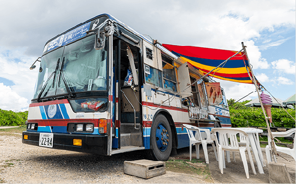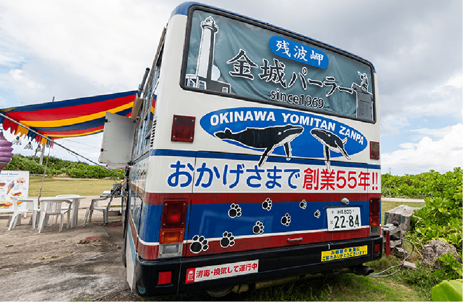 残波岬にある「金城パーラー」は、かつて沖縄を走っていた路線バスをお店として改装した、ちょっと変わった外観が目印です。「潮風でサビてしまうので、数年に一度は車体を取り替えています」と笑う店主の金城さん。今は観光地として有名な残波岬ですが、シンボルとなる灯台ができる前からこの地で先代がパーラーを営んでおり、少しずつ変化する地域の歴史をみつめてきた老舗店です。