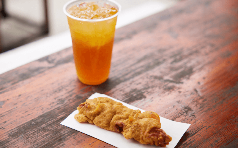 ブラジル在住の親戚のレシピを再現したジューシーなチキンは、ガーリックと胡椒がポイントになっており、いくらでも食べられそうなおいしさ。アイスティーとマンゴージュースを独自に配合した、人気の「マンゴーティー」と一緒に召し上がれ。