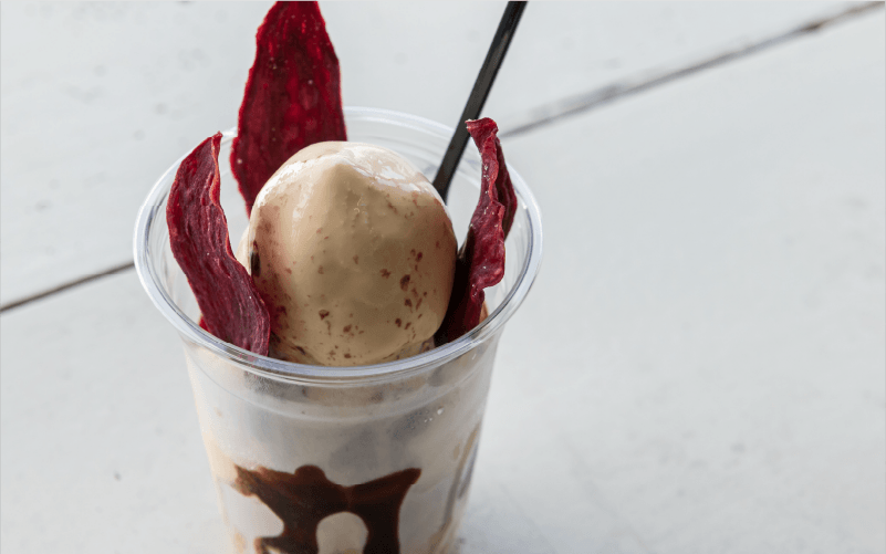 やさしい甘さの紅芋アイスとプレーンなソフトクリームが一緒に味わえる贅沢な一品。カリカリとした食感の紅芋チップスや紅芋に合うチョコレートソースがトッピングされており、さまざまな風味が楽しめて満足感があるため、ドライブ休憩のおやつとしてもおすすめです。
