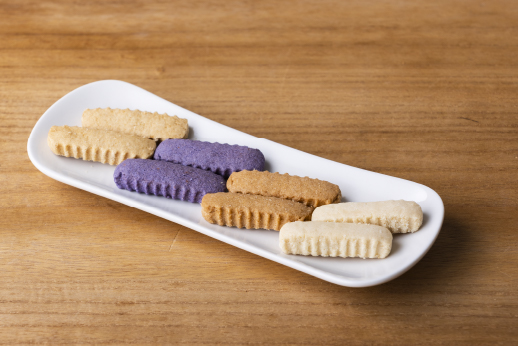 沖縄土産の定番「ちんすこう」は、琉球王国時代に中国から伝わり、かつては貴族しか食べることのできない宮廷菓子でした。豚肉をよく使う沖縄の食文化の影響もあり、ちんすこうには豚の脂であるラードが使われているのが特徴。サクサクとした食感とコクのある味わいの秘密はそこにあります。ながはま製菓の手づくりちんすこうは、黒糖、紅芋、塩味、バニラの4種類。小分けされているのでおみやげとして配るのにも便利です。