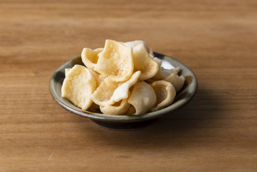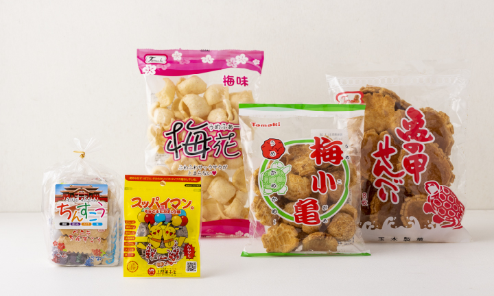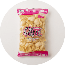まるでひらひらと舞う花びらのような形がキュートな梅花は、ピンクのラインが引かれた袋が目印。梅肉パウダーがたっぷりかかった、甘じょっぱいスナック菓子です。素朴ながらもやみつきになる味わいで、一度食べたらリピート確定です。舌にのせるとふわっと溶けるような軽さなので、その感覚を楽しむも良し、サクっとした食感を楽しむも良し。一袋あってもペロリと食べられちゃいます。
