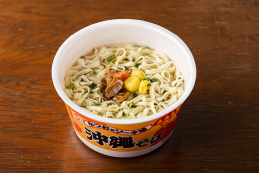 沖縄といえば沖縄そば、と言うほど沖縄を代表するメニューである沖縄そばのカップ麺。食べる時はお湯を入れるだけでOK。かやくには、沖縄そばに欠かせない豚肉も入っています。沖縄そばといえば、細麺、太麺など、お店やメニューによって種類がありますが、「マルちゃん カップ 沖縄そば」の麺は、コシの強い幅広の麺。かつおとソーキ味の濃厚なスープとよく絡みます。紅ショウガもついているのでお好みで入れるのもおすすめです。