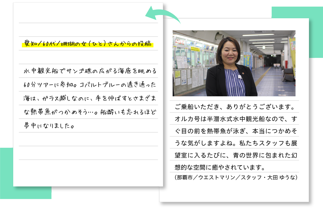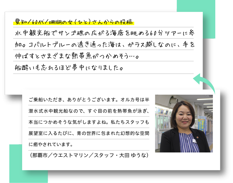 お寄せいただいた沖縄旅行のエピソードとともに、地元の方からの返信メッセージを添えてご紹介します。