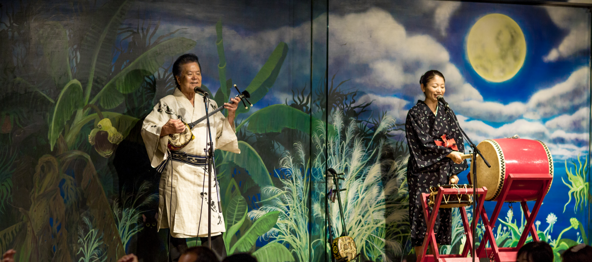 沖縄民謡から沖縄ポップスま幅広いレパートリーで楽しませてくれる。ライブの終盤はもちろんカチャーシーで!