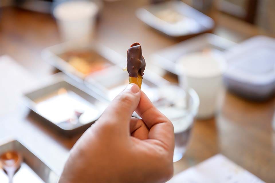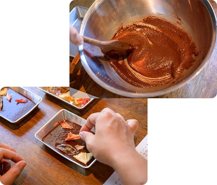 何度も温度を測りながら慎重にテンパリングをしたら、型に流し込み、最後に県産ドライフルーツをトッピング。ドライフルーツはチョコレート作りの前に味見させてもらえるので、自分の好きな味をプラスすることができます。