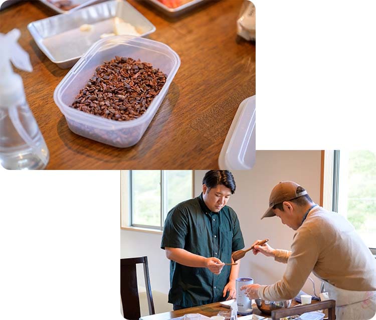 まずはカカオ豆の殻を1粒1粒丁寧に取り除き、粉砕機に入れ細かくしていきます。しばらく攪拌すると、砕いたナッツのような状態だったものが、カカオ豆から出てくる油分でしっとりまとまってきます。