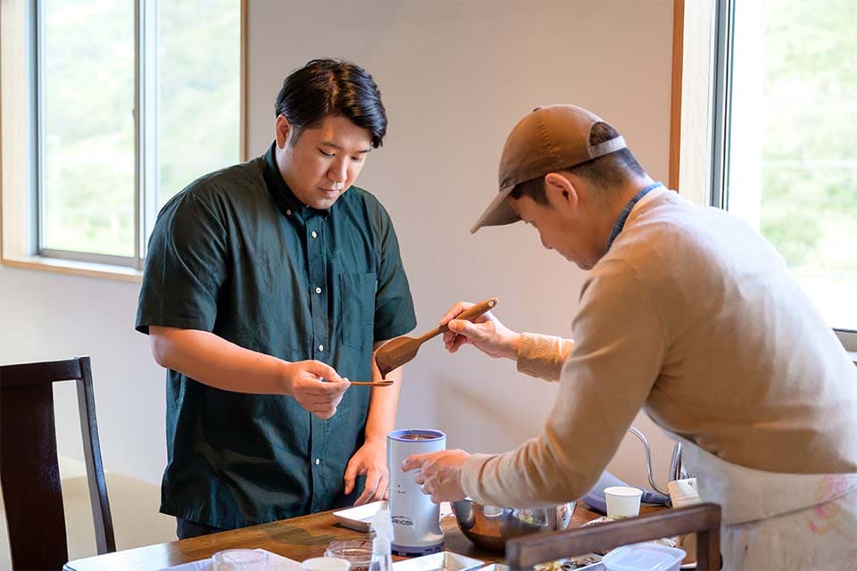 カカオバターを加えてさらに混ぜると、もったりとした見慣れたチョコレートの姿に!味見をすると「苦味は少ないけど、酸味を感じます。」と宮城さん。