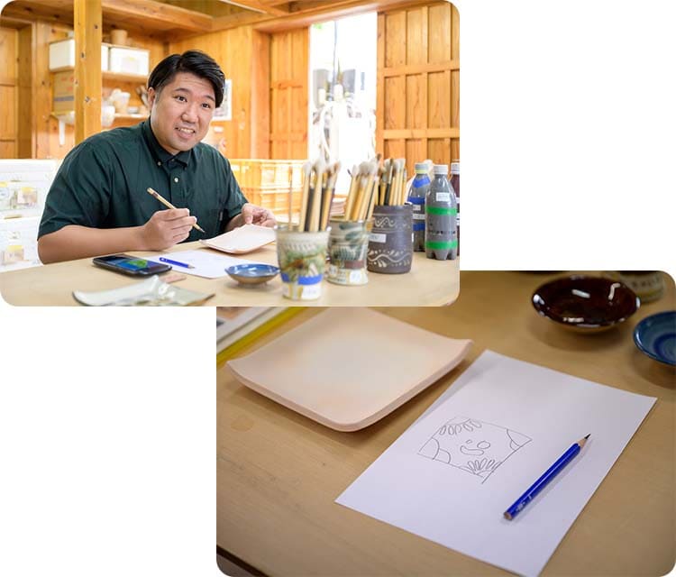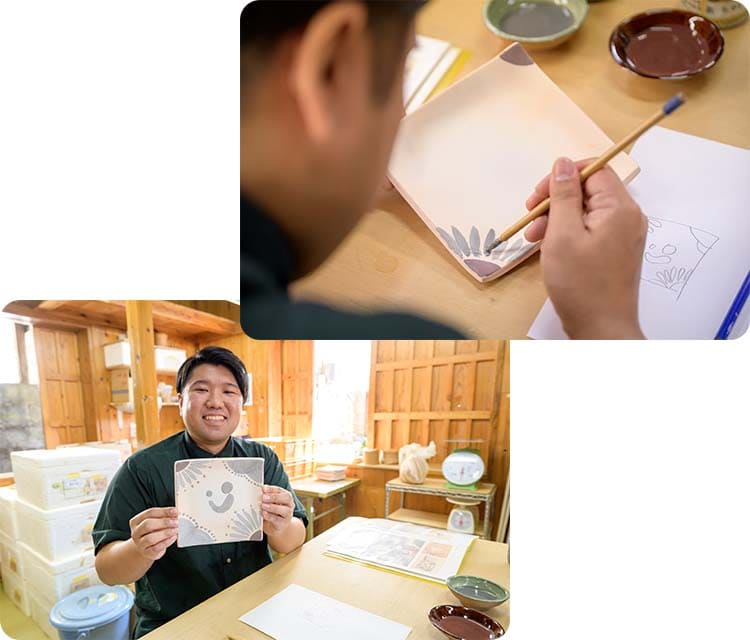 宮城さんは「事務所に飾りたい」ということで真ん中にソラシドエアのロゴマークと、縁に菊文様を配置するデザインに。コバルト(青)・ルリ(緑)・アメ(茶)の伝統の釉薬を使いながら素焼きの器に色付けをしていきます。