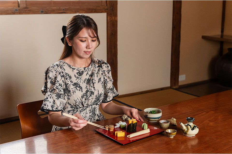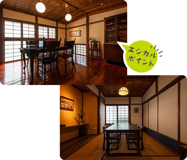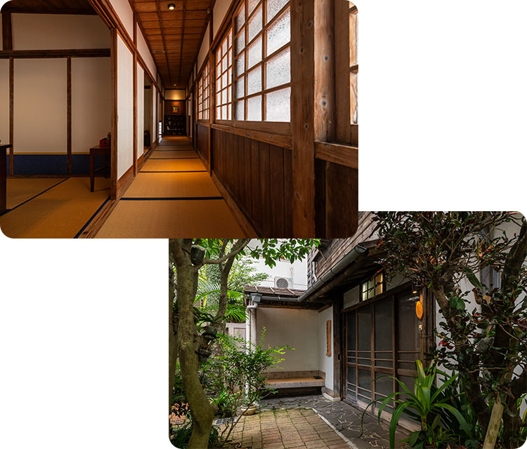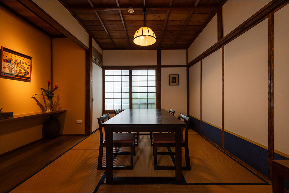 外観は沖縄らしい赤瓦を使いながらも、客室は京都の数寄屋の様式を取り入れ、舟底天井に、段差のない床の間など、沖縄の古民家とはまた違う趣があります。手入れの行きとどいた美しい店内には、登美さんと2代目店主であった古波藏 保好(こはぐらほこう)さんが集めたやちむん、琉球漆器、琉球張子、紅型などの工芸品が並び、その一つ一つは博物館に展示されるような歴史あるもの。「登美は漆が大好きだったんです。」と教えてくださったのは女将の石川薫さん。3代目の古波蔵德子さんから譲り受けたという琉球絣の着物をお召しの姿から、美榮の受け継いできた信念を感じることができます。