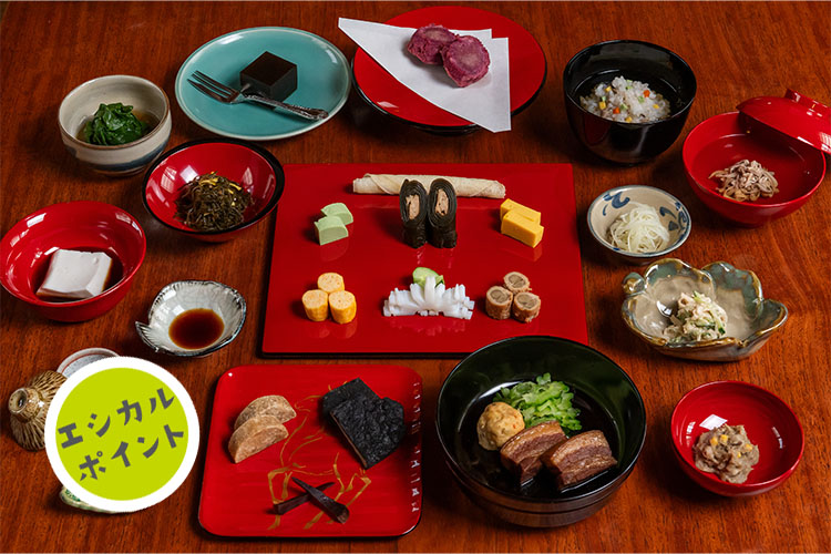 琉球料理はひとえに宮廷料理をさすのではなく、宮廷料理に加えて庶民の料理や行事料理も含めたもの。中国や日本をはじめとした外国との交易があった琉球王国はその影響をうけ、混ざり合い、琉球料理がつくられていきました。