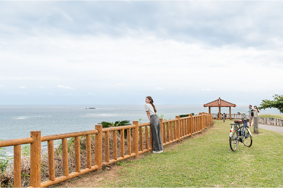 続いてがんじゅう駅から奥へ進み「知念(ちねん)岬公園」に向かいます。知念岬公園は太平洋が一望できる絶景スポット。コバルトブルーの海の先には神の島「久高島」や、無人島の「コマカ島」を望むことができます。自転車で遊歩道を下っていくと、視界いっぱいに海と空の景色が広がり、自分と向き合う時間を与えてくれるよう。夕日や朝日の時間に来ても美しい眺望を堪能できます。