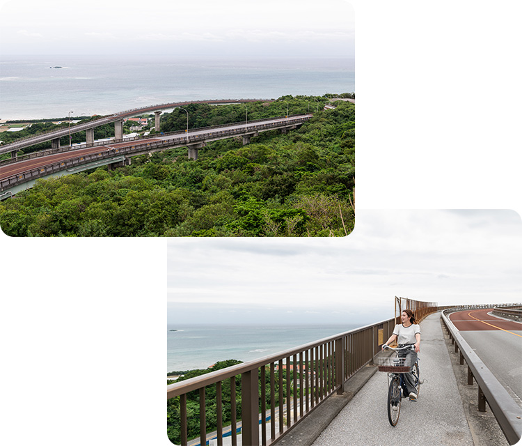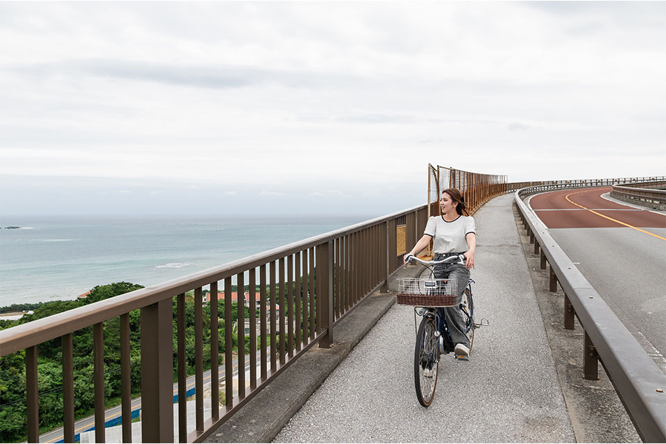 知念岬公園からドライブスポットとして人気の「ニライ橋・カナイ橋」に向けて自転車をのんびり走らせます。ニライ橋・カナイ橋の絶景スポットは、U字にカーブを描く全長660mの橋をのぼった先にある展望台。電動自転車のアシスト力に助けてもらいながら絶景を目指します。ニライ橋・カナイ橋は歩道が整備されており、車では気づけない歩道に設置されているレリーフも楽しむことができます。息を切らしながらたどり着いた展望台からの景色はニライカナイ(理想郷)という名の通り。下に広がる絶景を眺めながら、ここまで橋を上り切ったという達成感が味わえるのもポタリングならでは。