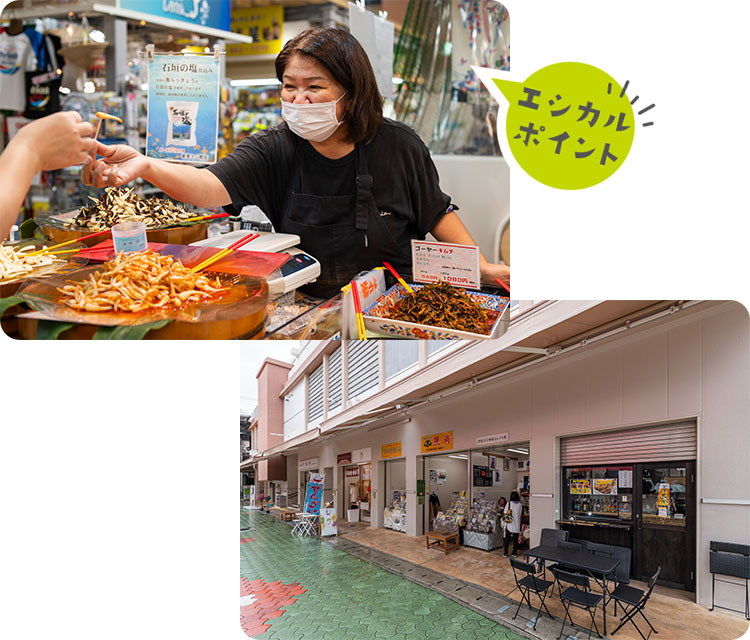 牧志公設市場ではお店の方との会話を楽しむことも醍醐味の一つ!食べたことのない食材は、食べ方の相談をすると地元の人でも知らないとっておきの味わい方を教えてくれることも。試食をさせていただけるお店では、島らっきょうにゴーヤー、パパイヤなど沖縄ならではの食材をつかったお惣菜を試せるので「ゴーヤーとこの組み合わせが合うんだ!」なんて意外な発見もあるはずです。