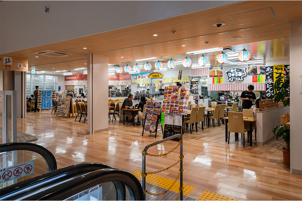 市場の中は吹き抜けになっており、1階は鮮魚、精肉、漬物にもずく、海ぶどうなど多くの県産食材が並び、2階は食堂で沖縄の家庭料理を楽しむことができます。