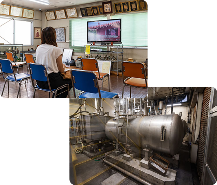 瑞泉酒造の酒造見学では、まずは2階に上がりビデオで瑞泉酒造の成り立ち、琉球泡盛の製造方法、戦前の黒麹菌を使用した「御酒(うさき)」の製品化に至るまでの過程を学び、2階や1階でガラス越しに機械を見学することができます。この酒造見学は1日で30名以上、多い時で100名のお客様がいらっしゃるんだとか。