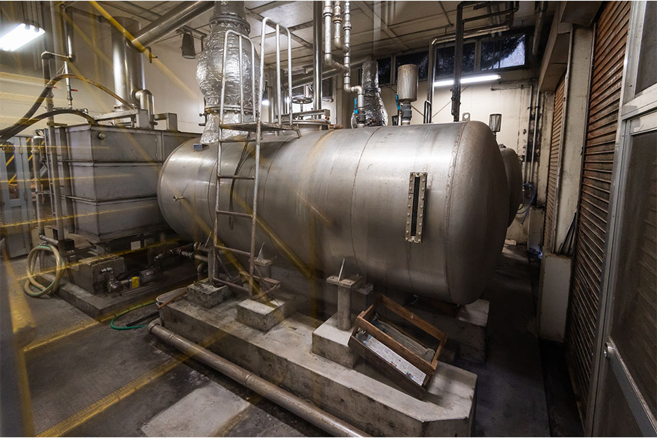 「時期によって異なりますが、工場は1ヶ月に2回のサイクルで泡盛を作るので、蒸米でお米の香りが充満している日もあれば、蒸留で匂いで酔いそうなほどアルコールの香りが室内にひろがっている日もあるんです」と教えてくれたのはこの日ガイドをしてくれた與儀さん。ガラス越しに見える大きな古酒の甕がずらりと並ぶ様子が見られるのは施設見学ならでは。