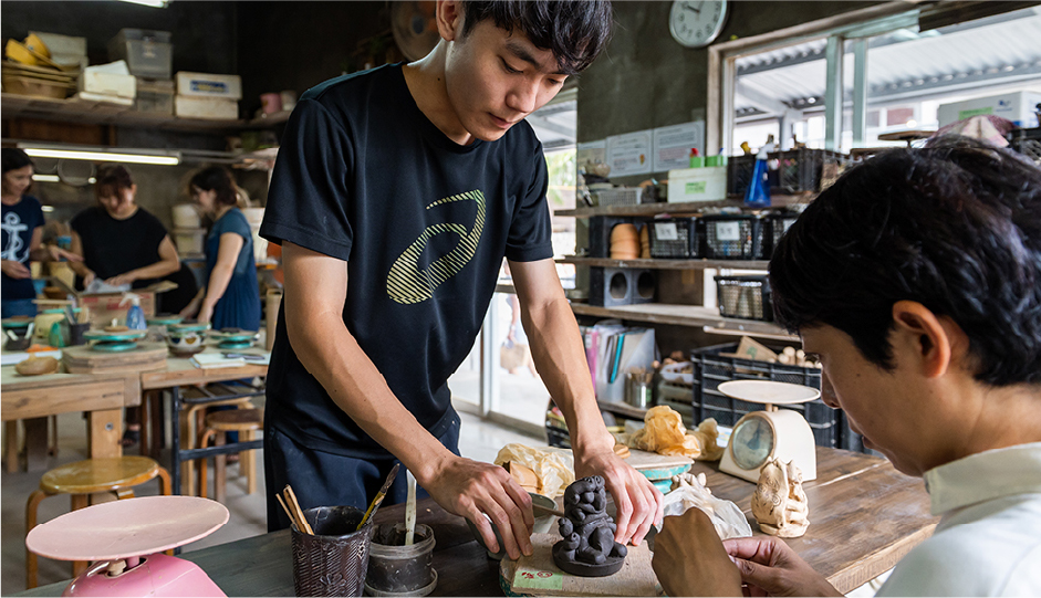 壺屋焼の窯元として、伝統を守りながら新しいチャレンジをしている「壺屋焼 陶眞窯」は、工房の一角でやちむん体験を実施しています。家族や友人と一緒に体験したい方におすすめなのが「シーサー作り体験」。土の塊からシーサーのパーツを作り出し、土台に合わせて一から作成するため、体験スタッフのレクチャーのもと、本格的なシーサー作りを楽しむことができます。