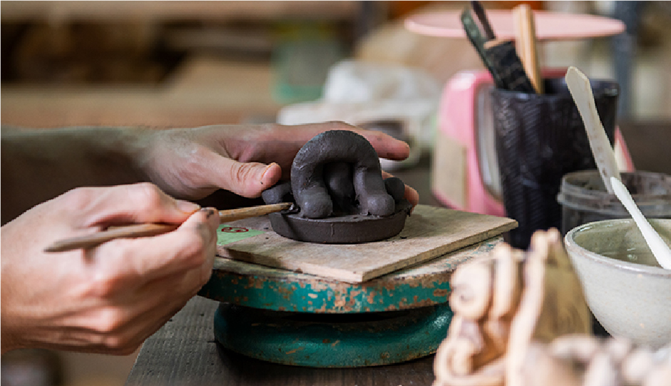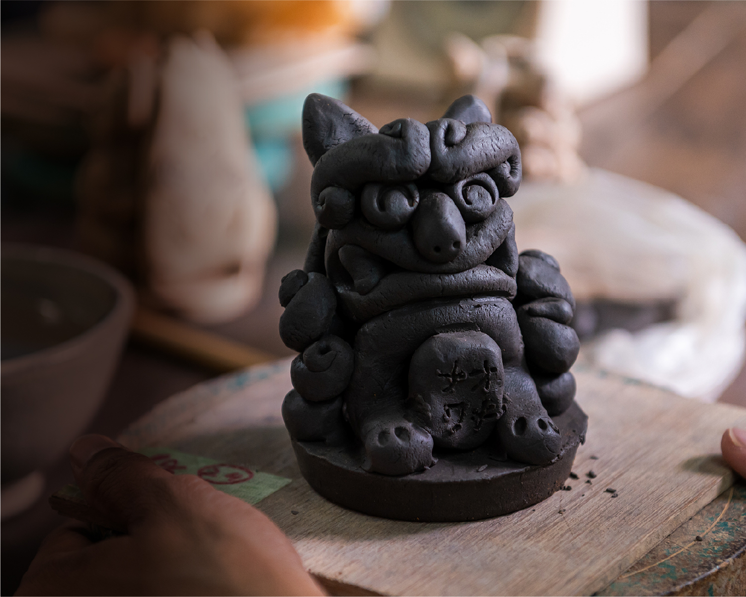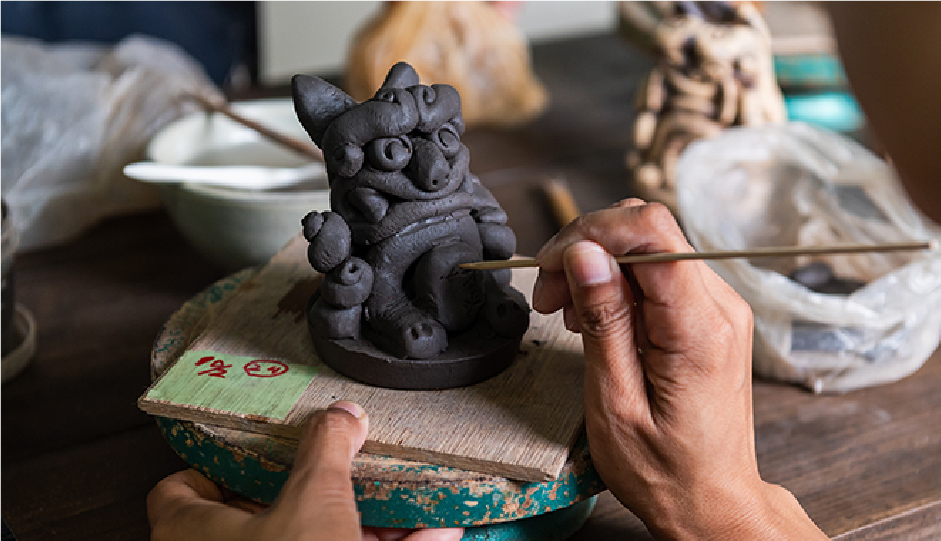 まず最初は前足からスタート。その後はスタッフのアドバイスをもとに、シーサーの足元に置く表札や顔などを順番に作っていきます。最も難しいのは、くるんとカールしたまゆげやヒゲの部分。指先を使って手作業で行いますが、細かい部分は竹串などの道具を用いて馴染ませ、工夫しながら作成します。工程を経るごとに、徐々にシーサーらしい姿になっていくため達成感も十分です。