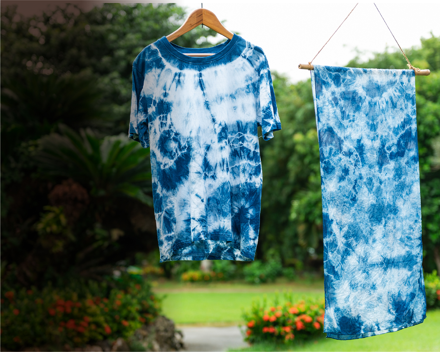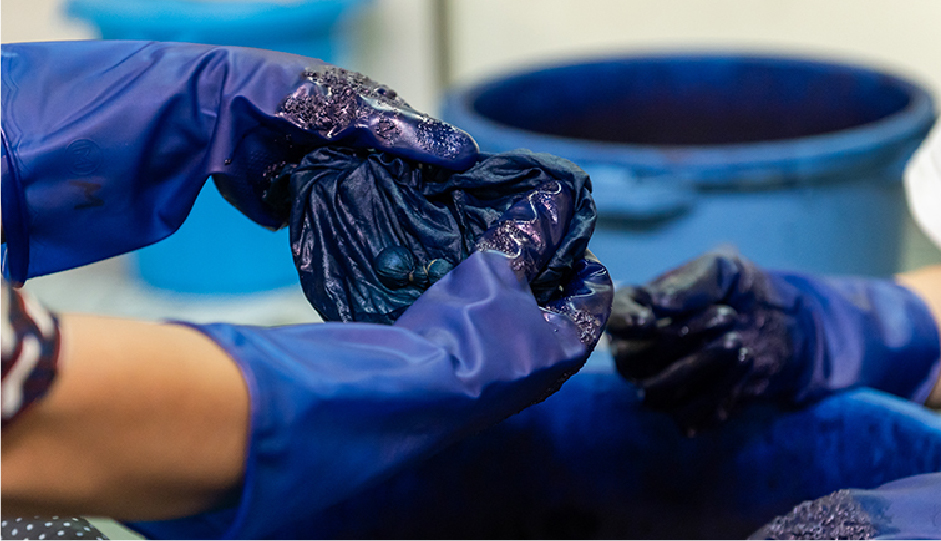 緑豊かな宮古島市熱帯植物園内にある宮古島市体験工芸村では、宮古織物事業協同組合が運営する「織物&染物工房」にて気軽に本格的な藍染体験ができます。重要無形文化財に指定されている宮古上布の産地で藍染職人が教えてくれるとあって、体験者の満足度も高いのが特徴。通常、宮古上布の染料には琉球藍が用いられますが、こちらでは扱いやすいインド藍を使用します。