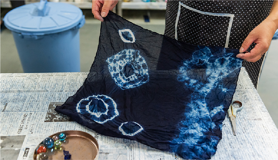 子どもでも体験できると人気の「ハンカチしぼり染め体験」は、大小異なるビー玉やおはじきをハンカチに輪ゴムでくくりつけて、黒糖と泡盛で発酵させた藍に5秒ほどくぐらせることを繰り返して染色します。所要時間は1時間程度。ビー玉などの大きさや輪ゴムのしぼり方、染色の回数などで仕上がりが異なるので、作り手によってさまざまな柄のハンカチが完成します。