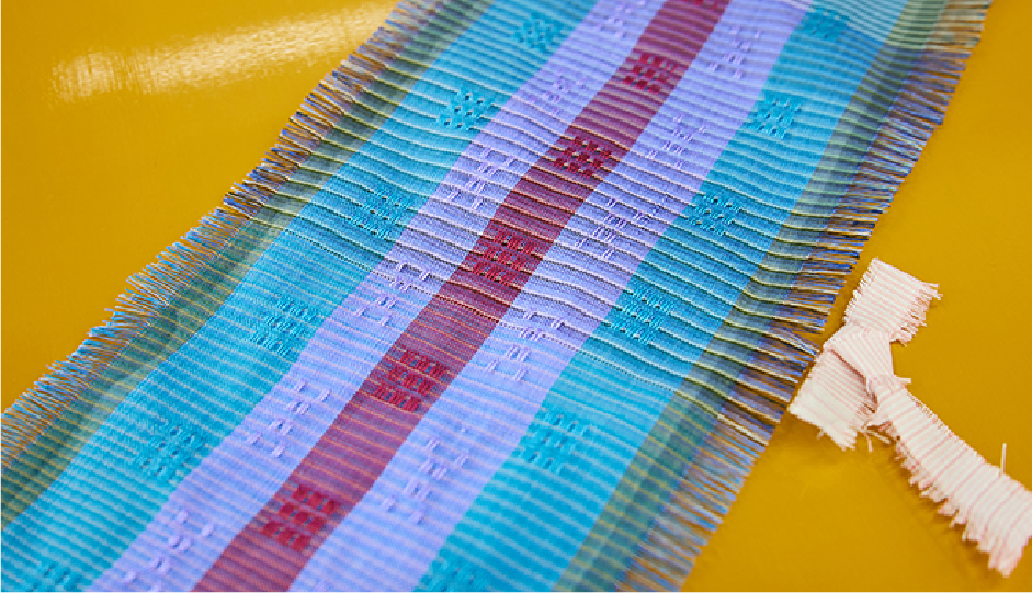 シャーッ、トン、シャーッ、トントン…左右を行き来する規則的なリズムが心地よい平織りは、最も基本的な織り方のひとつ。花織の部分は、足下にある仕掛け紐を足で引きながら杼を通すため少し複雑ですが、徐々に浮かび上がる美しい模様を見ていると、自分の手で織っているという実感がわいてきます。約60〜90分時間で幅36㎝、長さ約10㎝の花織の布が完成。沖縄旅行の記念に、自分に贈るお土産としてもおすすめです。
