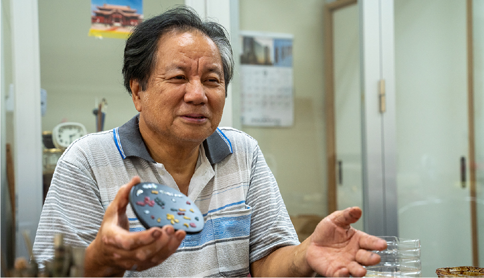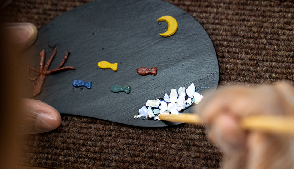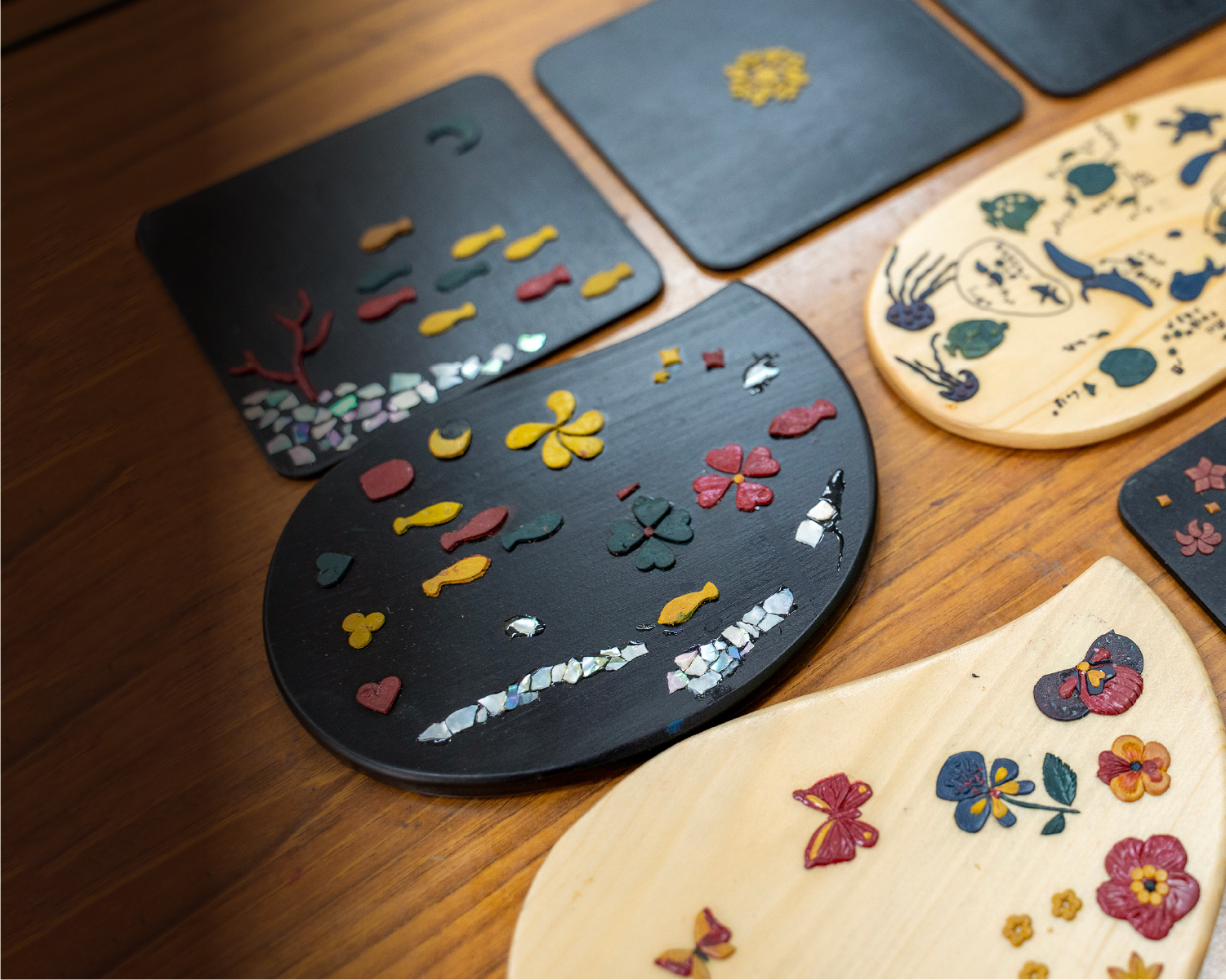 「体験を通して琉球漆器を知ってもらえたら嬉しいです。あまり肩肘張らず自由に作ってみてください」と微笑む森長さん。工房には夜光貝を砕いた螺鈿(らでん)の材料も用意され、パーツとして使うことができます。美ら海を泳ぐ魚や、森の木々、珍しい生き物など、滞在中に見た沖縄の風景をデザインすれば、どこにも売っていないあなただけのお土産が完成します。