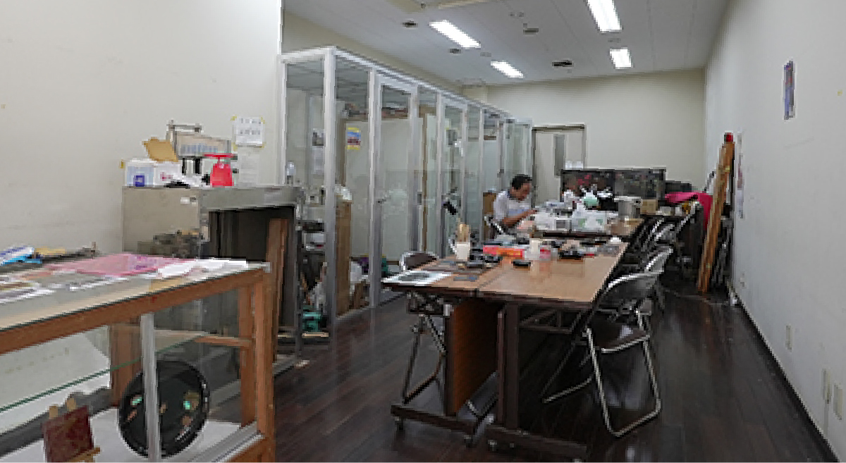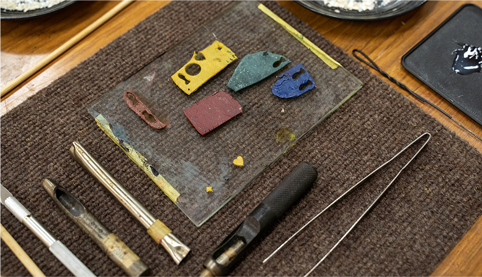 「てんぶす那覇」の体験施設では、「琉球漆器」特有の加飾技術として知られている「堆錦(ついきん)」を体験することができます。漆と顔料を練り合わせた「堆錦餅(ついきんもち)」と呼ばれる漆の塊を薄く伸ばしたものがあらかじめ用意されているため、あとは講師のレクチャーに従い、じっくりと製作を楽しみましょう。