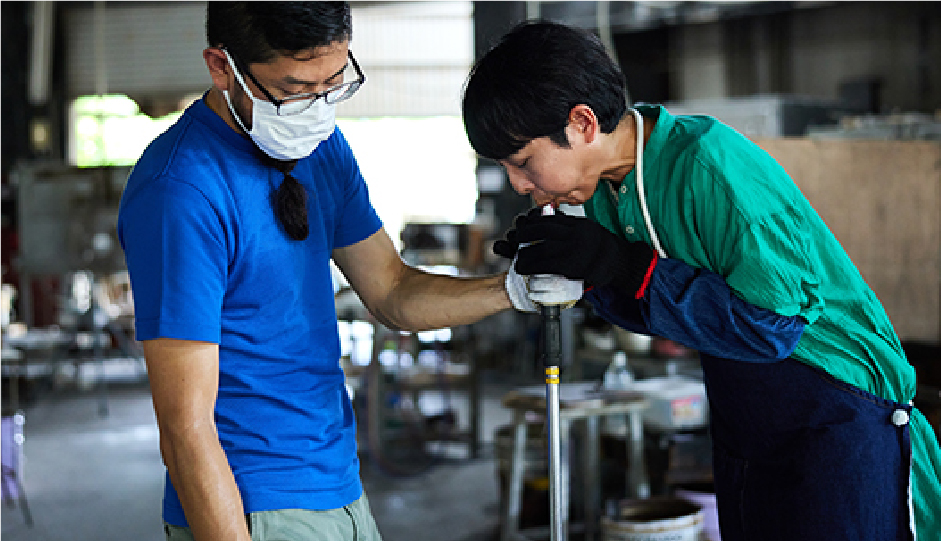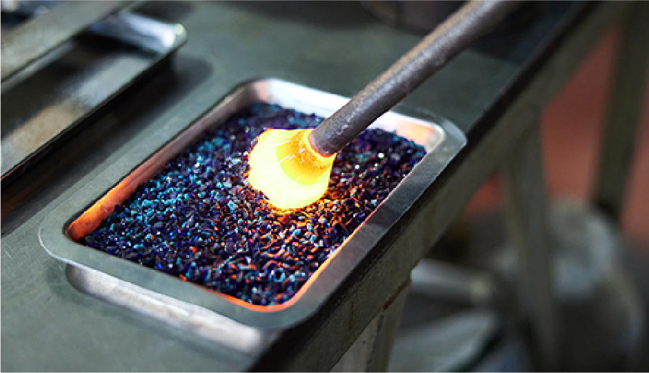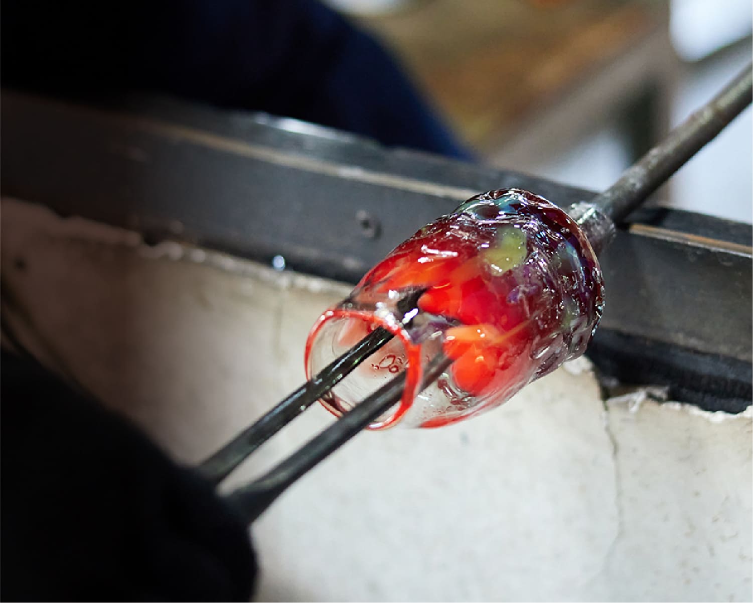 最初に職人が、製作するグラスの色に合わせたカレット(ガラスの欠片)を準備し、溶解炉からガラスを竿に巻き取る様子を見せてくれます。1300℃で熱されて水飴のように溶けたガラスを型にはめたら、ここからは体験者の出番!「型吹き」という技法で、竿の端からゆっくりプーッと息を吹き込むと、みるみるうちにガラスが膨らんでいき、心が躍ります。