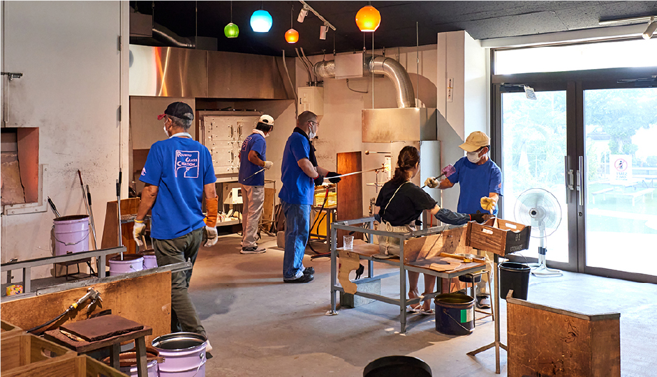 その後は右手に洋ばしを持ち、左手で竿をコロコロと転がしながら、グラスの飲み口を広げて形をきれいに整えていきます。ガラスはすぐにかたくなってしまうため、グラス全体に洋ばしが触れるようにリズミカルに動かしながら素早く成形することが大切だそう。現在「琉球ガラス村」では、主に室内工房での体験を実施しており、快適な空間で気軽に沖縄の伝統工芸「琉球ガラス」作りを楽しむことができます。