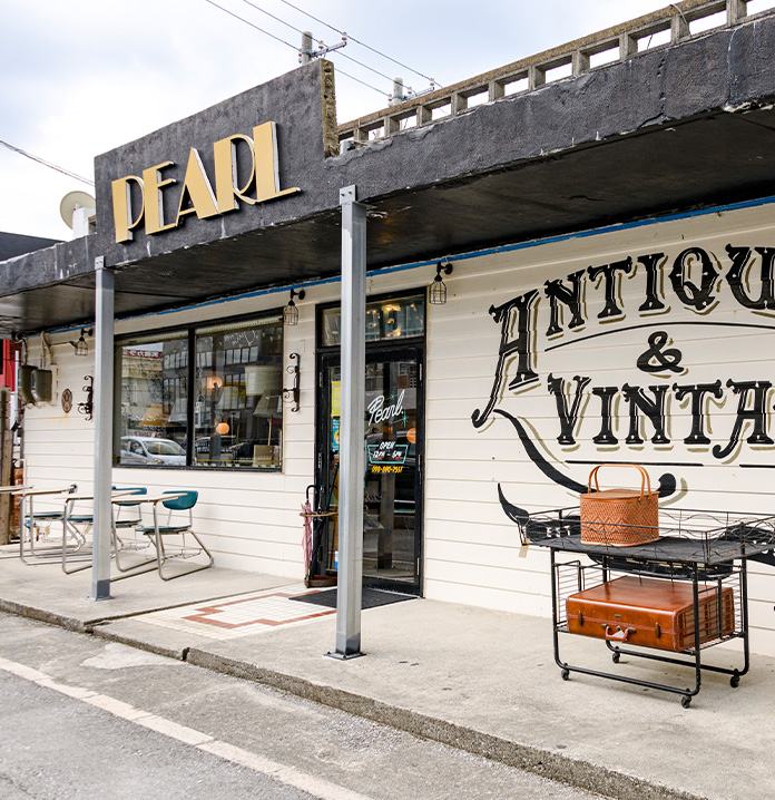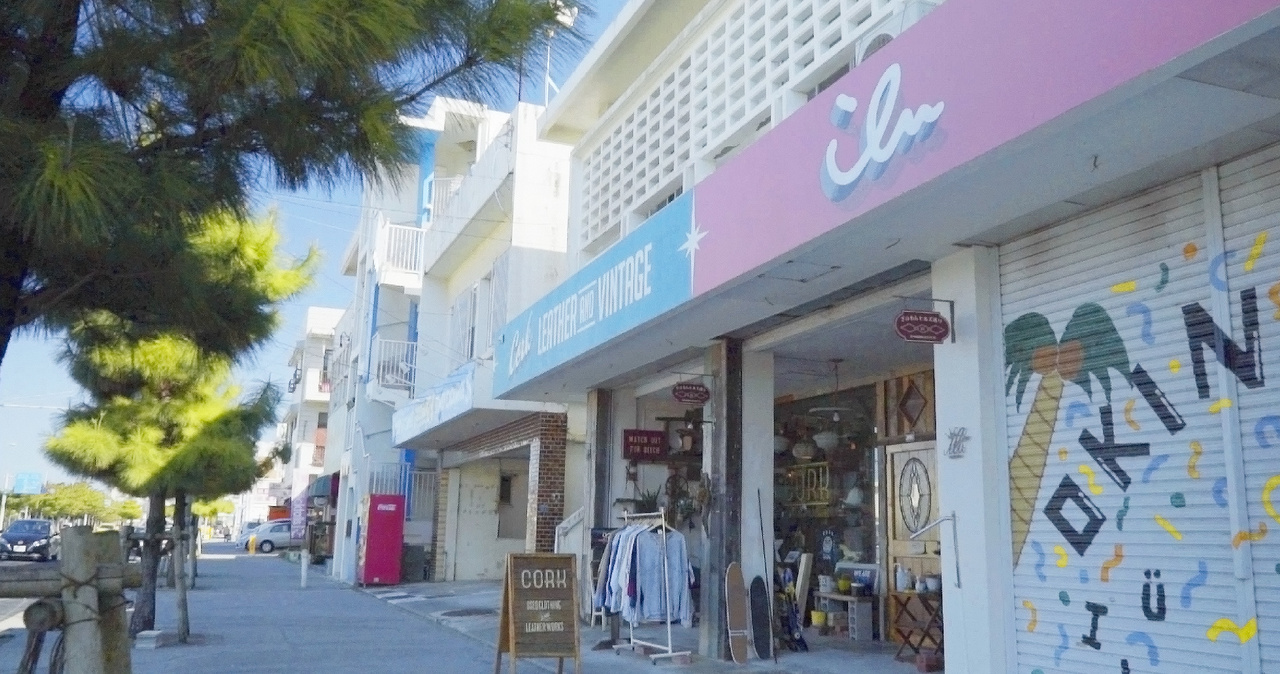 基地に隣接する周辺エリアには、どこかオールドアメリカンな雰囲気が漂います。この場所には「ファニチャーストリート(家具屋通り)」として知られるエリアがあり、国道58号線を挟むようにして、輸入家具やヴィンテージウェア、こだわりのインテリア用品のお店が点在。ユニークな外壁やガラス越しに見えるポップな色合いの小物などに、ついつい足が止まってしまいます。