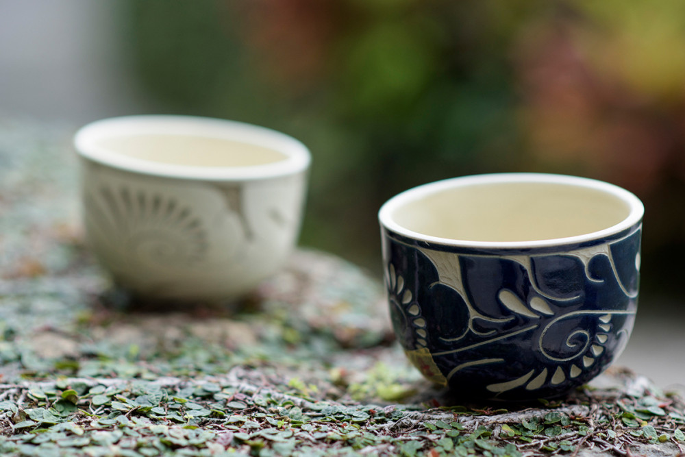 他にも、竹の断面に赤や青の釉薬を付けて白地の器体に、印鑑のように押して、絵付けを施したお碗やカップも人気が高い。