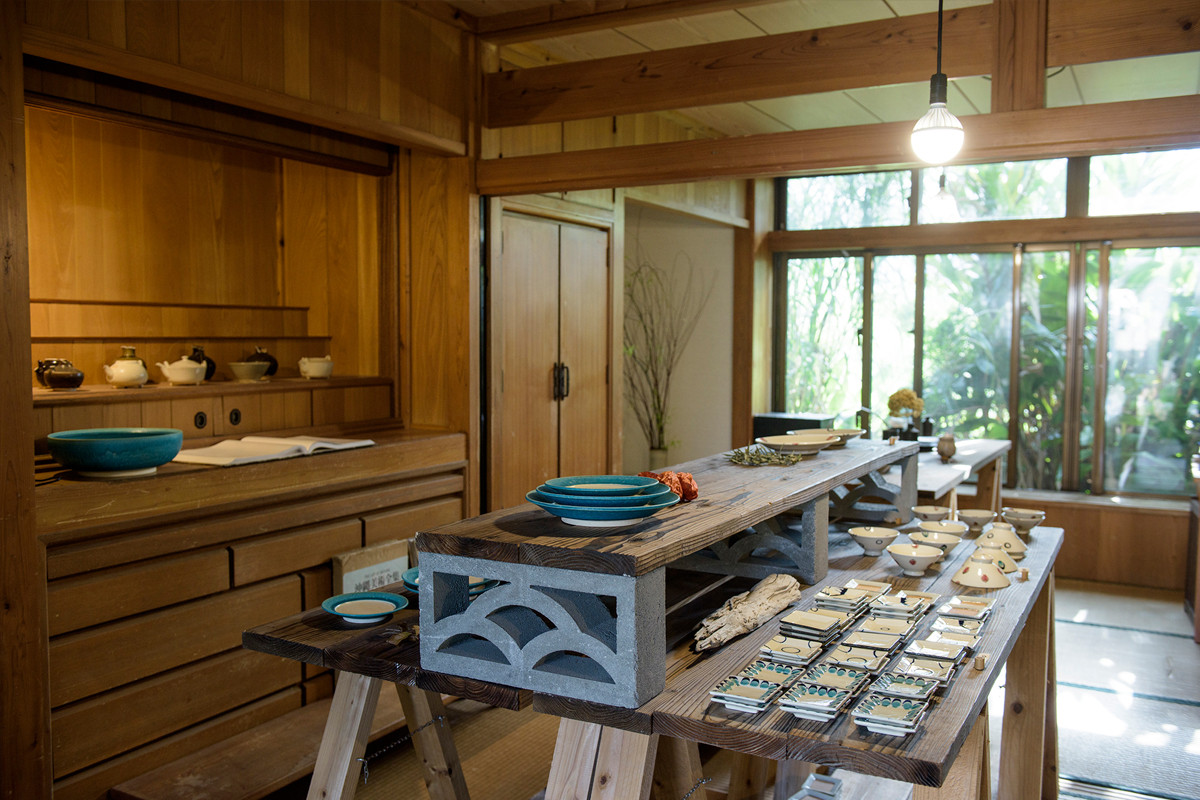 まるで絵のような心癒されるサトウキビ畑の風景が収まった窓からは優しい光が差し込み、その光がスポットライトの役割を果たし、器の美しさを引き立てている。