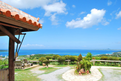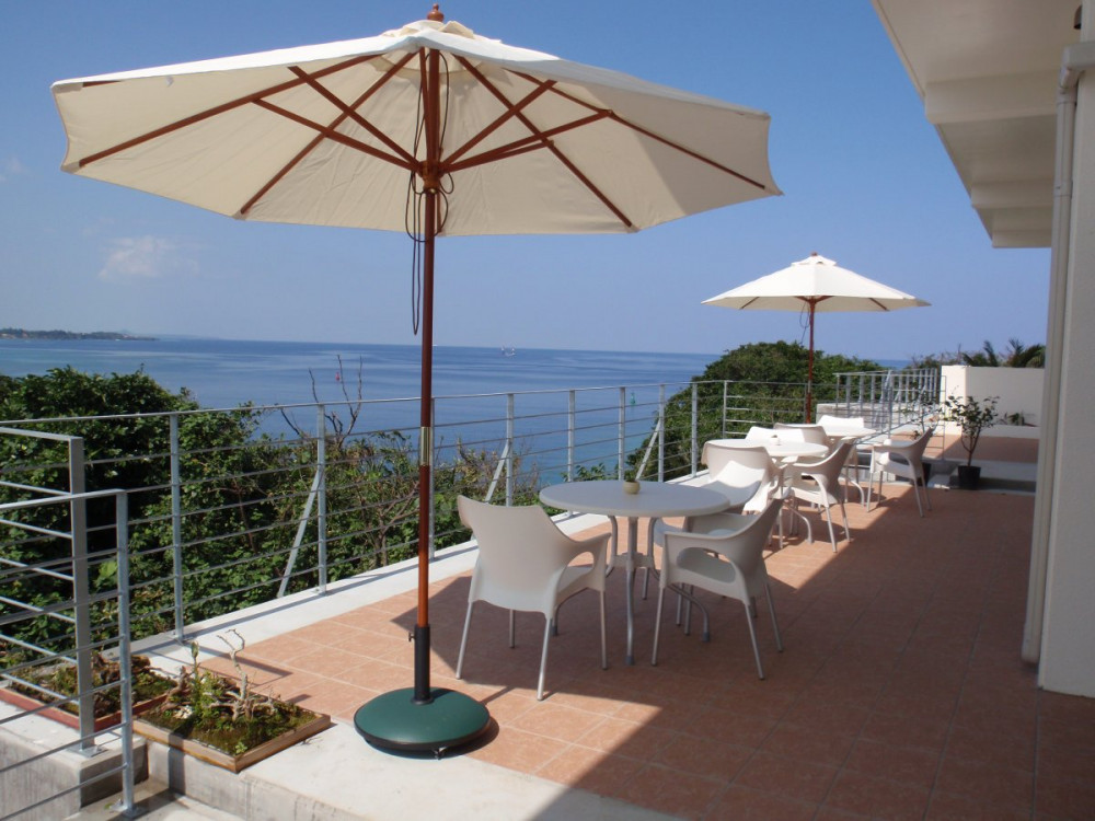 広いテラスからは、伊江島、瀬底島、水納島まで眺められる、絶景もすばらしい!