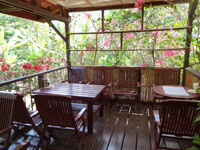 その奥の小川沿いの喫茶店で、都会にはない安息の空間を提供しています。山側のテラスでは、色濃い緑と四季折々の花々が美しく咲いています。また、野鳥のさえずりが、心を落ち着かせてくれます。