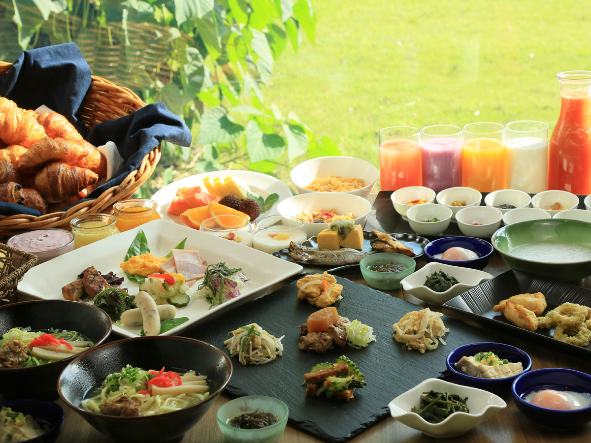 朝食付きプランの基本はこちら。朝食は島素材あふれる50種類の朝ごはんを用意。