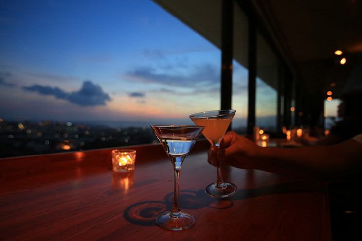 昼から夜に変わるトワイライトタイムには、空と雲の自然のキャンバスに描かれる、息をのむほど美しい色の移りかわりや、海に沈む夕日などが見られます。この素晴らしい眺望は高台のホテル最上階にあるこのお店だけのもの。