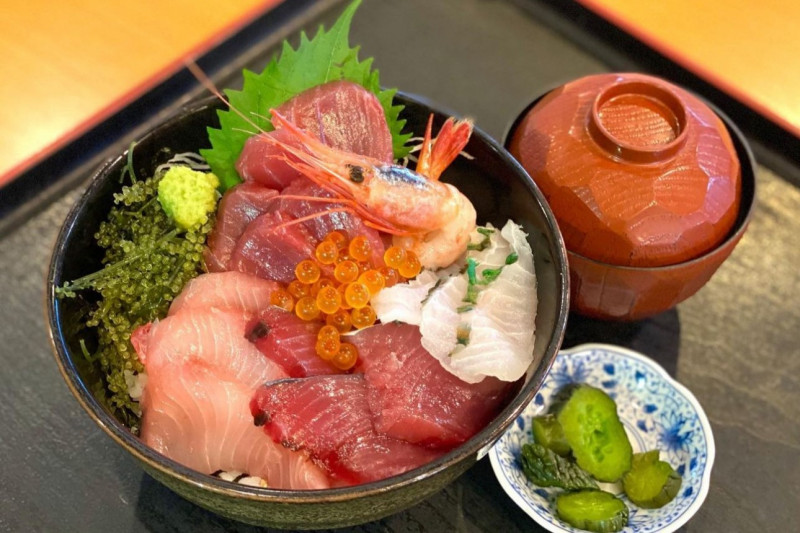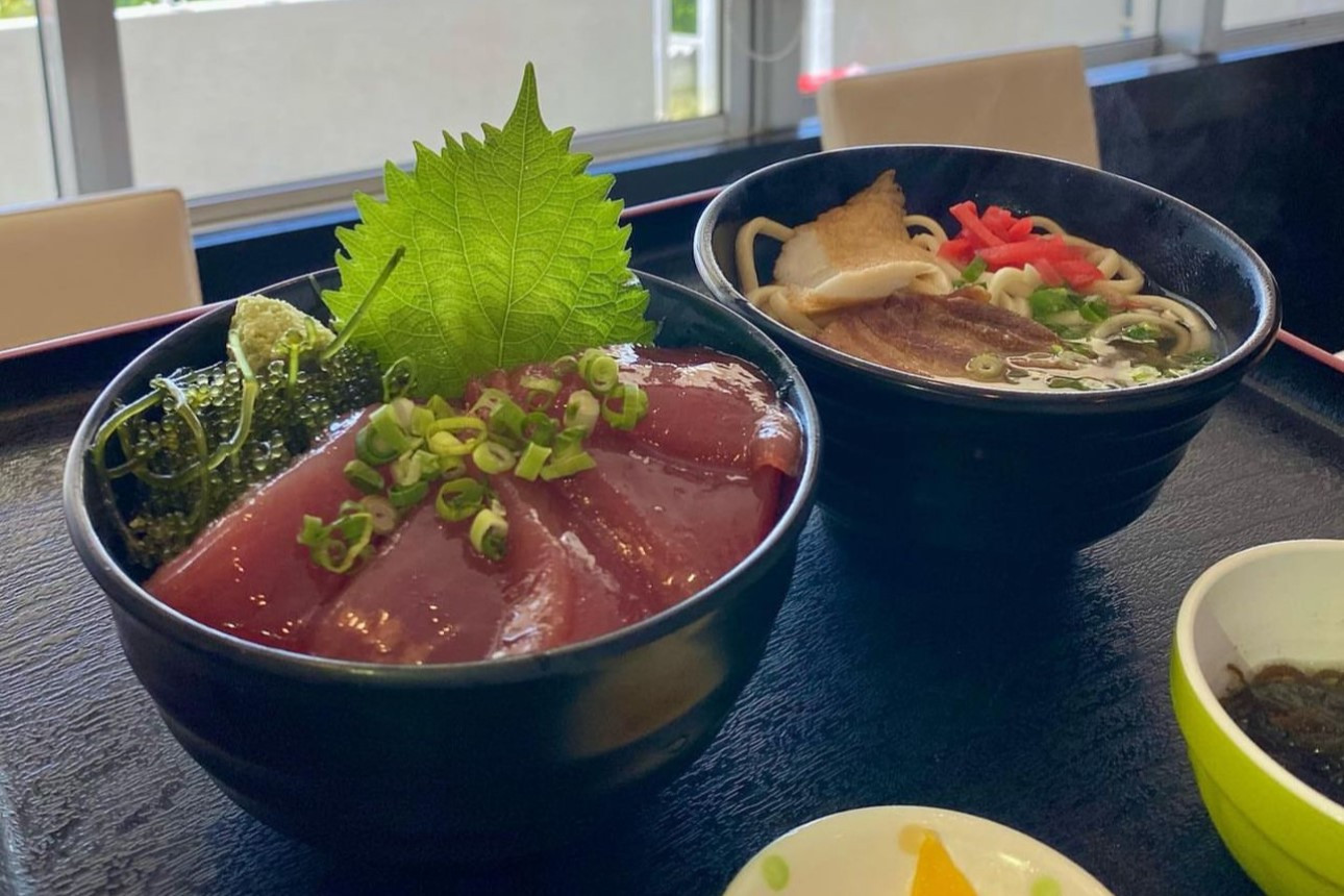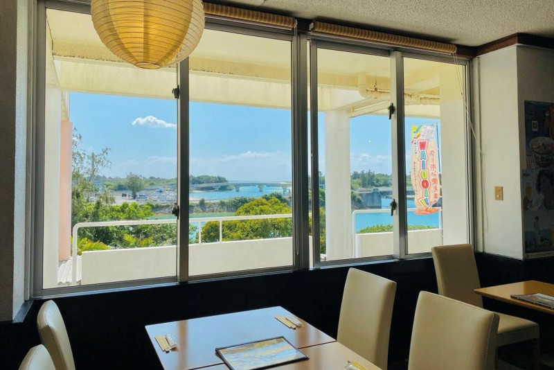 伊良部島のホテルサウスアイランド内にある「レストラン入江」。ゆったりとした時間を過ごしながら、目の前の入江から広がる青い海を見渡せるのが魅力的。人気の伊良部定食はグルクンの唐揚げ、お刺身のみそ和え、モズクなど伊良部町ならではの食材を使った料理だ。その他、宮古そばに肉と野菜がたっぷり入った肉そばも好評だ。ここから歩いて5分の渡口の浜で遊んだ帰りに食事していく客も多い。