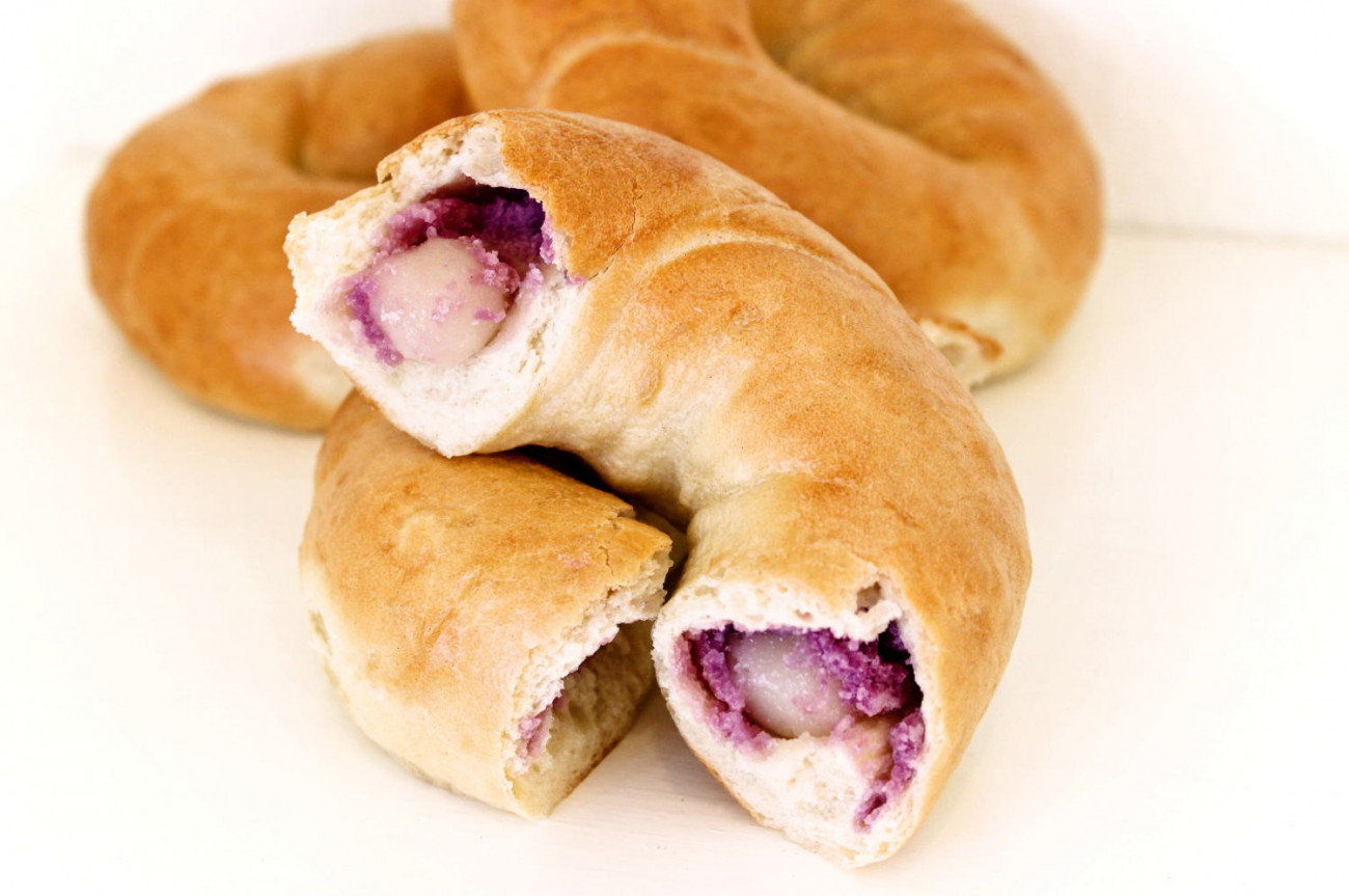 (ベーグルは、牛乳・バター・卵・マーガリンを使わない、茹でてから焼いたパンの一種です。)