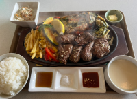 一番人気のあぐー豚のサーロインステーキは3種のソースで味の変化も楽しめます。