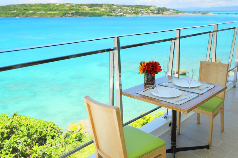 沖縄本島随一の美しさを誇るスカイブルーの海と古宇利島を臨むUMIZORA(ウミゾラ)。