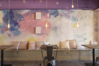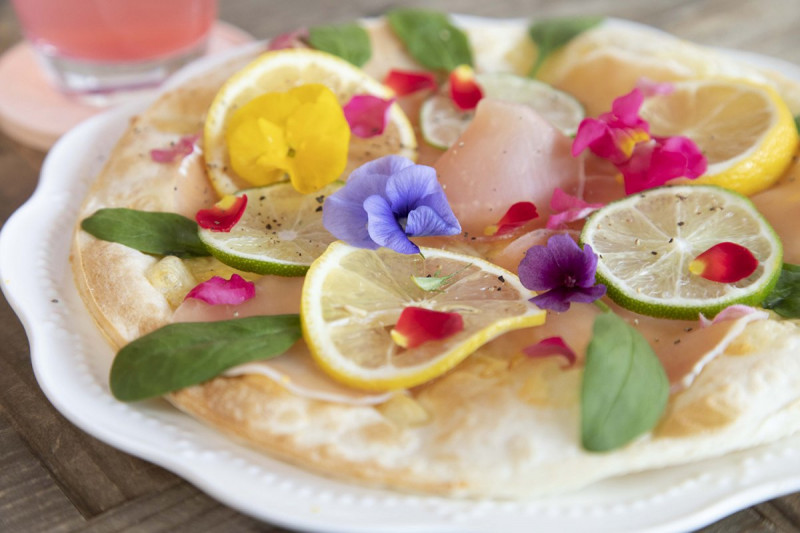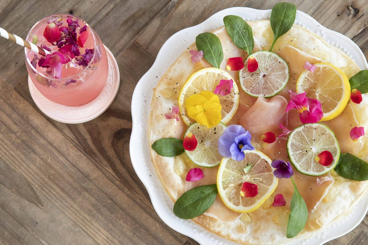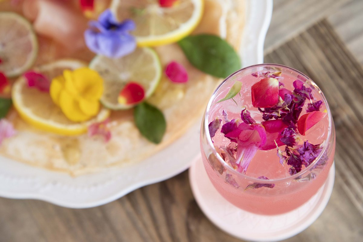 パステルカラーを使った水彩画で彩られた壁紙、電球のライト、小鳥と花が描かれた窓、店内のどこを切り取ってもおしゃれなお店、DAISY...。ノンアルコールカクテルやピザ、カレーなど、エディブルフラワーを使ったメニューは見た目だけでなく、味にもこだわっています。「頑張っているすべての女性へ花束を」というコンセプトのもと、メニューやディスプレイを考えたというオーナーの濱畑さん。日頃忙しくしている人の安らぎの場を目指しています。