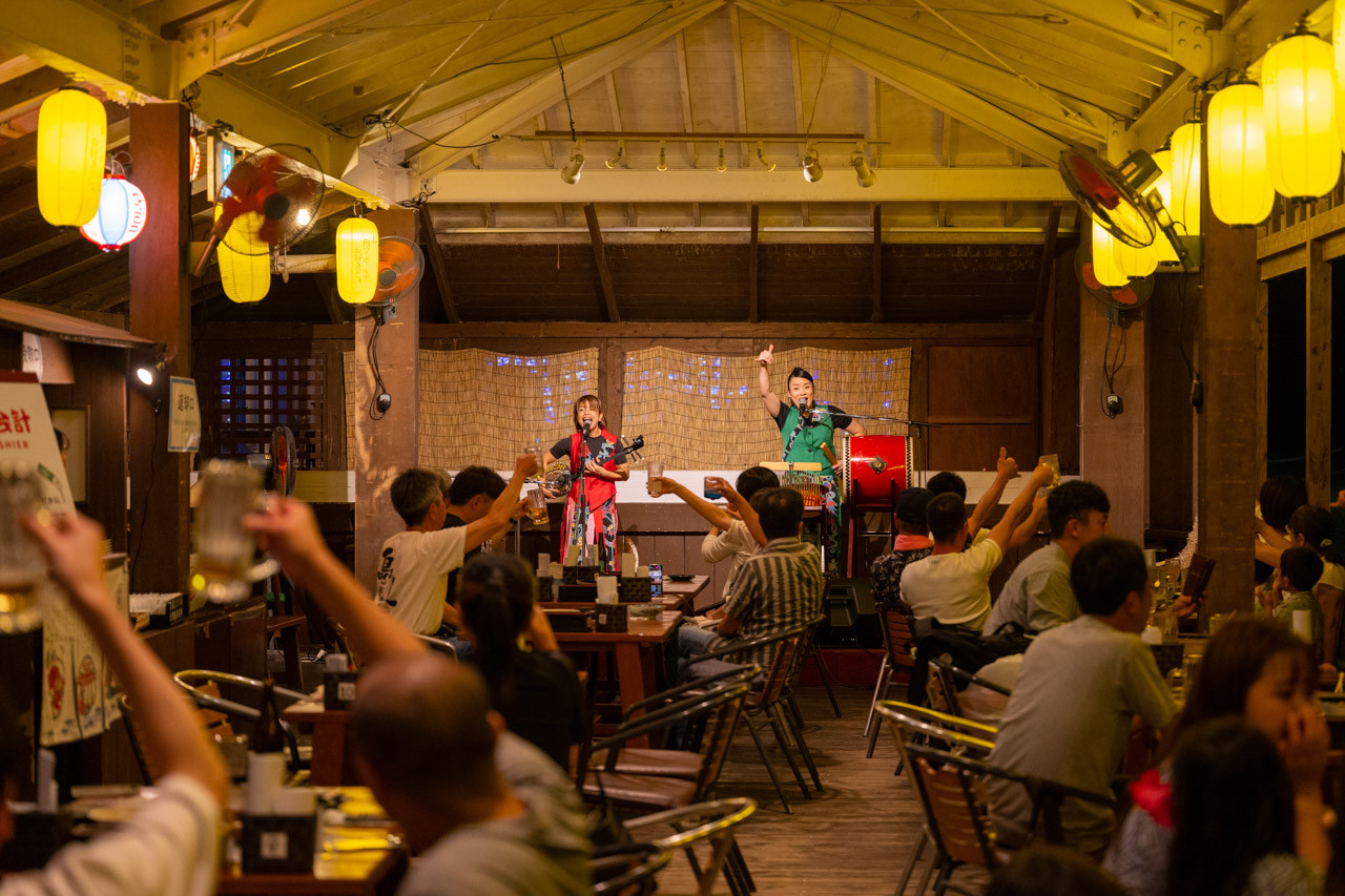 ビーチに隣接したオープンテラスの居酒屋では毎日20時からと21時30分からの2回島唄&三線ライブを開催。