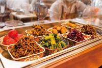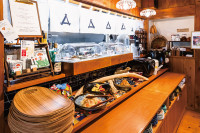 名護市の住宅地にひっそりと佇む古民家に一歩入ると、ナチュラルテイストのインテリアでまとめられた暖かい空間が広がります。「主役はやんばる野菜」という想いを込めたおそうざいは20種類以上もあり、ナムルやソムタム、低温調理器を使ったメニューやタイカレーなど多国籍感満載。お肉やお魚などはメイン料理(別料金)として、不定期替わりで提供されます。店内はテーブル席、座敷席、テラス席などがあり、女性客やファミリーなど幅広い年齢のお客様が訪れます。夜になると「スコッチとアテ」としてお酒とおつまみを提供する空間に。ランチタイムとディナータイム、それぞれ異なる雰囲気の中でおいしい時間を過ごすことができます。古民家の一室にはショップコーナーがあり、藍染古着ブランド「BOKUWAKUMA」の商品や、オーナー自ら買い付けたアジアの洋服や雑貨を購入できます。