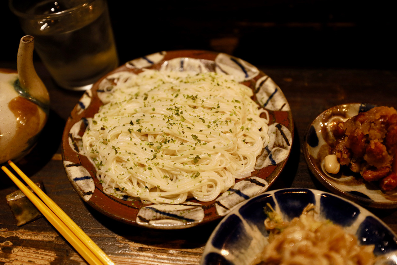 1階はカウンター、2階は座敷席になっており、カウンター席は観光客でも一人でも居心地が良い。沖縄県内47酒造所の泡盛がずらりと並び、好みのグラスを選んでショット(50ml)、半合(90ml)、一合(180ml)と少しずつ味比べができる。人気のメニューは、この店が最初に居酒屋で提供したといわれている「ソーミンチャンプルー」。具材の少ないシンプルな味付けだが、一度食べたら忘れられない味だ。