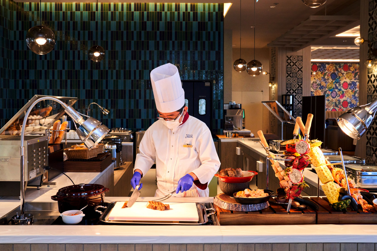 開放的な空間を持つ店内では、五感で楽しむライブキッチンで、沖縄県産食材を使った料理をはじめとした食、笑顔、洗練されたサービスで「おもてなし」いたします。