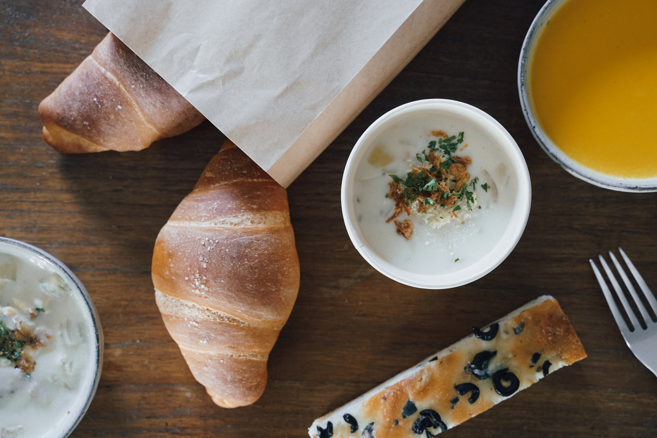 温かいスープを、焼きたてのパンと一緒にどうぞ。